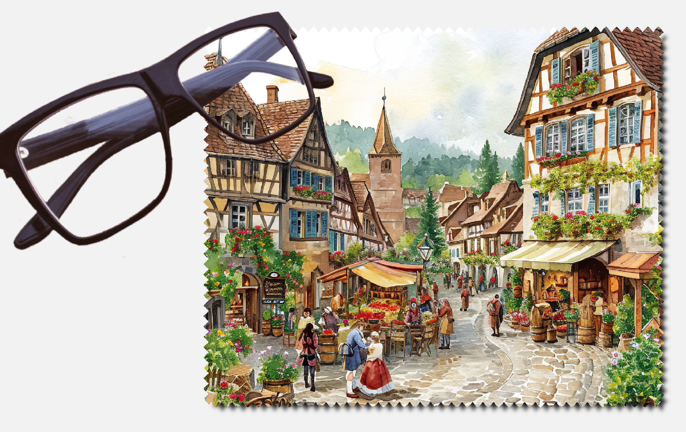 Lots of people in an olden days town with a cobble road lens cleaning cloth