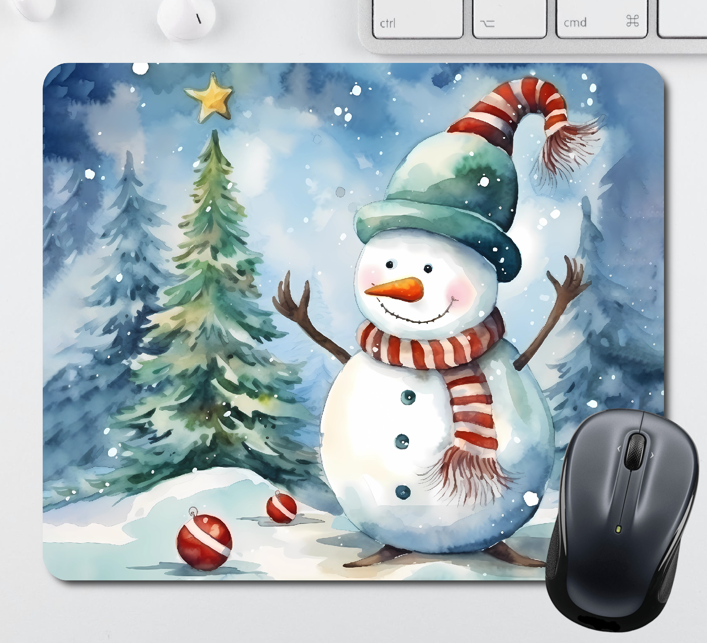 A Snowman with a Green Hat and a Christmas Tree and Baubles.